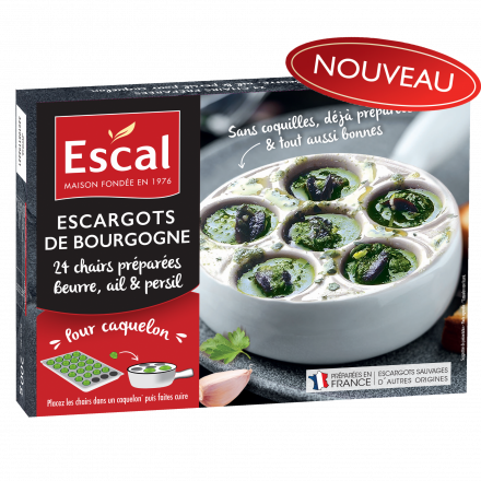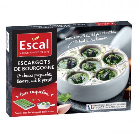INGRÉDIENTS : Chairs d’escargots* de Bourgogne cuites 45%, beurre 40%, eau, persil 3,8%, ail déshydraté 1,8%, échalote, sel, épices, plantes aromatiques (dont céleri).
